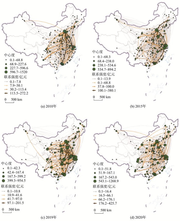 图3报告了2010—2020年基于上市公司与客户贸易关系的城际网络流量规模与城市节点数量的演化情况。从贸易总量上来看,整体上呈现出快速扩张到缓慢下降的变化趋势,其中,2010—2016年,贸易流量快速增长,由3397.8亿元增长到6706.9亿元,这一时期我国经济位于中高速增长阶段,上市公司发展势头良好;2017—2020年呈现缓慢下降的趋势,从6223.3亿元下降到4581.9亿元,这与同期我国GDP增速由2010年的10.3%下降至2020年的2.3%具有一致性,上市公司发展面临一定的压力。从节点数量来看,呈现出先增加后缓慢减少的态势,由2010年的207个增长到2013年的304个,2014—2020年节点数量相对稳定,贸易节点保持在250~280之间。2020年,受新冠疫情的影响,网络贸易总量呈现明显下滑,较2019年下降了15.9%,但贸易节点数量并未出现大幅度下滑,较2019年仅减少了10个,表明新冠疫情对整体网络流量产生了较大冲击,但并未对网络节点数量产生大的影响,整体贸易网络框架相对稳定。