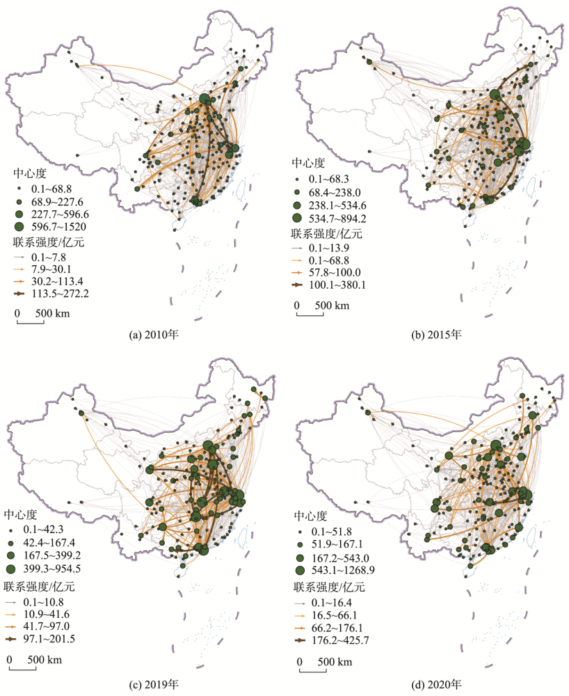 | 图7 2010—2020年中国城际网络演化格局 注:该图基于自然资源部标准地图服务网站下载的图号为GS(2019)1815号的标准地图制作,底图无修改。由于数据获取困难,本次研究不包括香港、澳门和台湾。 |
