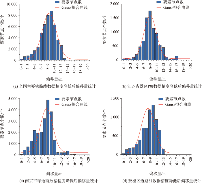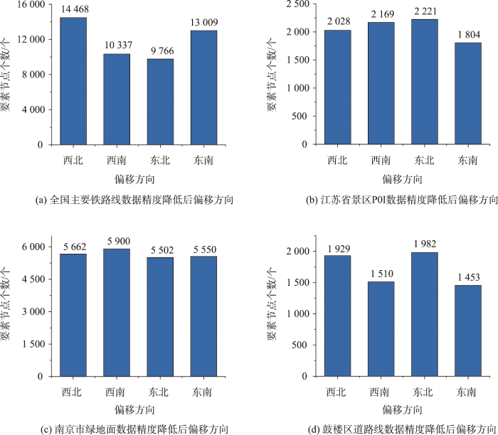 (2)统计处理后要素节点的偏移量与偏移方向,偏移量呈现出以目标精度10 m为中心正态分布的趋势,单个节点的偏移量不超过20 m;同时要素节点在东南、东北、西南、西北4个方向上均有偏移,表明精度降低后数据稳定性较好,且具有全局上随机偏移的特征,使精度降低后数据难以被恢复。