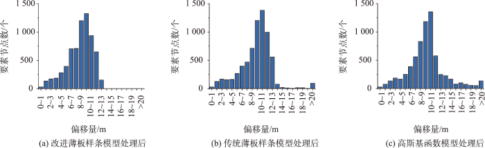 如图11所示,3种精度降低处理方法得到的偏移量都呈现以目标精度为中心的近似正态分布,在8~11 m内较为集中。改进薄板样条处理后坐标偏移区间为0 ~13 m,偏移量在数值上具备良好的稳定性。而传统薄板样条精度降低模型与基于高斯函数的精度降低模型得到的偏移量区间范围较大,最大偏移量均超过30 m,更易在局部区域上发生突变。