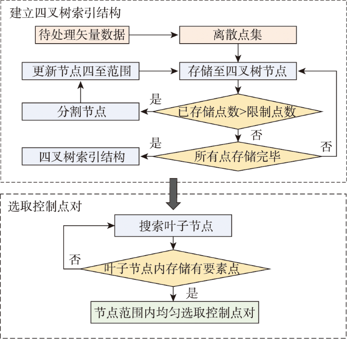 因此,本文提出顾及空间分布的控制点选取方法,即考虑待处理矢量数据的数据量以及所包含的要素节点在空间上呈现出数量分布不均的情况,建立四叉树索引结构对图幅进行划分,从而对控制点的设置过程进行相应的约束,实现步骤如图2所示。将矢量数据的所有要素转为点集,并进行遍历,将点集中的点存储至四叉树对应节点中;若该四叉树节点内已存储点数大于限制点数,则对该节点范围进行划分,然后重新判断点与新节点范围的包含关系并进行存储。四叉树每个节点代表一个矩形范围,要素点集存储完毕后,选出存储有点要素的叶子节点,在其四至范围内均匀选择相同个数控制点,并按照叶子节点的遍历顺序设置每一个控制点偏移的方向与距离,使偏移方向在空间上渐进变化,最终构造出用于拟合的同名点对。