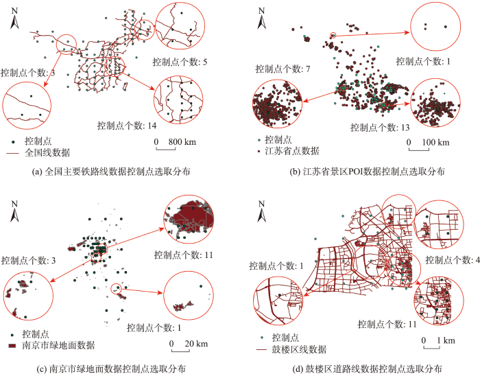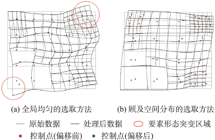 基于插值思想的变换模型需要利用已有控制点对作为已知数据来求解插值曲线,控制点对的选取情况直接影响到模型各参数的计算。由于矢量数据具有分布不均与要素量大小不一的特征[21],若直接使用全局均匀选取控制点的方法,在缺少人工手动减少误差的情况下,控制点偏移量与偏移方向难以根据待处理数据的特征进行控制,局部的插值结果则会可能受到干扰。