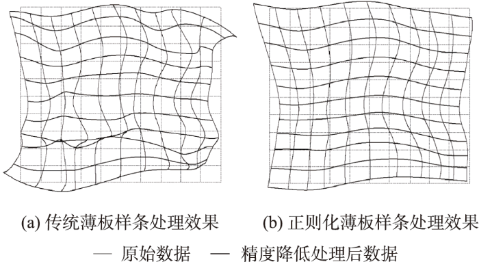 薄板样条能近似拟合复杂曲线形状,泛化能力弱,当选取的控制点对存在噪声时,会产生局部坐标突变、拓扑关系变化等问题,本文对插值函数进行吉洪诺夫正则化处理,提高模型抗噪能力。吉洪诺夫正则化(Tikhonov regularization)是通过正则化参数和正则化矩阵作用于原病态矩阵来改善矩阵的病态性[22],从而使求解得到的未知参数更为稳定且可靠。