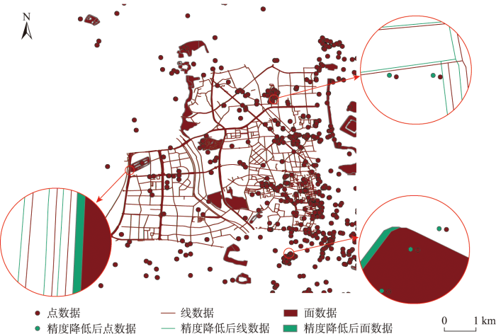 地理数据精度降低技术为解决上述问题提供了可行的途径。地理数据精度降低是指按照相关文件的要求过滤、删除涉密信息内容,降低空间精度,形成可在非涉密网环境中使用的公开数据集[2]。对于矢量数据的精度降低方法包括属性处理精度处理和几何精度降低,本文基于几何精度降低展开。