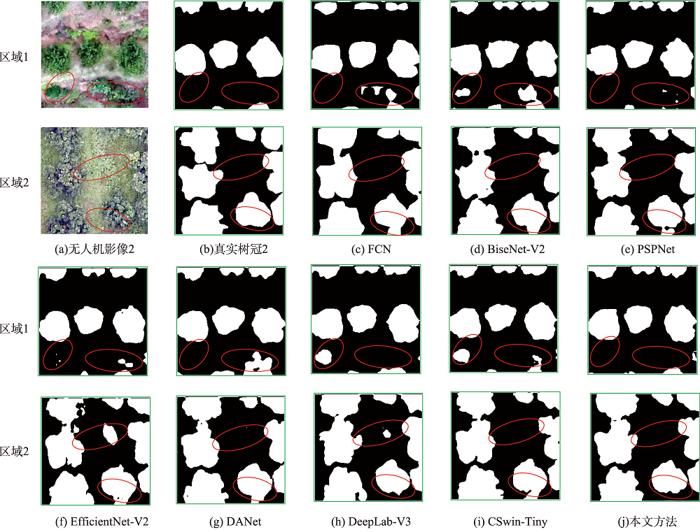 图11 CNNAMNet模型部分柑橘果树树冠分割子块对比 注:红色椭圆表示着重分析的区域。 |