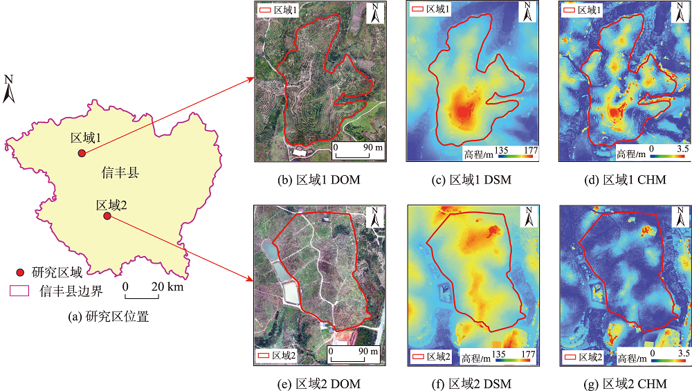 Fig. 9 Location, DOM, DSM, and CHM of the study area |