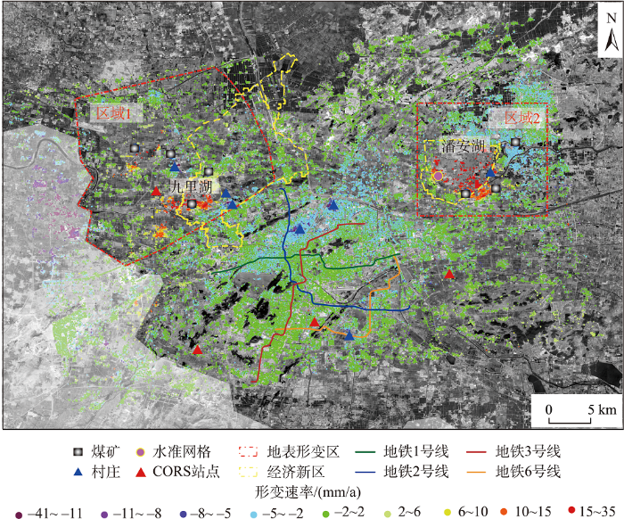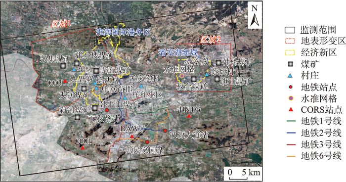 徐州市位于我国华北平原东南部、江苏省西北部、苏皖豫鲁四省交界处。研究区覆盖徐州市区范围(33.96°N—34.46°N,116.97°E—117.56°E)(图1)。地貌主要以冲积平原为主,海拔约20~50 m;局部有少量丘陵分布,海拔约100~300 m。徐州受中生代燕山运动影响强烈,形成弧形构造及纵向逆断层结构,有利于岩溶发育,导致岩溶洞穴与地下河流形成广泛,形成丰富的地下水资源[25]。同时,该地区的煤层也十分发育,煤炭开采活动与地下水开采是造成当地地质灾害的主要因素。近年来,为探索资源枯竭型城市的转型之路,徐州陆续关闭各处矿 井[26],开展采煤塌陷地区的生态修复和综合利 用[27-28]。徐州西北矿区(图1区域1)和东北矿区(图1区域2)的生态修复获得显著成效并成为全国采煤塌陷地生态修复示范项目,其中潘安湖生态修复工程于2017年12月得到了习近平总书记亲临实地考察时的高度肯定[29]。2020年徐州市政府针对两区域生态修复现状,以潘安湖湿地公园为中心规划建设潘安湖新城,以九里湖为中心设立徐州淮海国际港务区,承担徐州老工业城市转型和发展的职责[30]。虽然随着区域治理与生态修复的推进,地下水开采受到严格限制,相关地质灾害发生显著减少,但是徐州市的地表稳定性问题仍然不容忽视。特别是近年徐州城市迅速扩张,建筑物体量日益增加,且自2014年以来开始建设城市地铁网络,包括目前已经建成并运行的1-3号线一期工程及正在建设的3号线二期和6号线一期工程。因此,影响徐州地表稳定性的因素多而复杂,定期开展徐州地区地表形变时空动态监测十分必要。