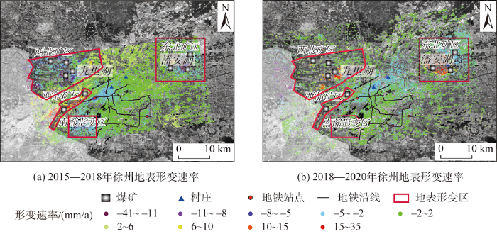 (2)2018—2022年,徐州市地表形变主要分布在城区、地铁沿线及西北、东北的煤矿老采空区范围。城区和地铁沿线呈现沉降趋势,最大形变速率达-17 mm/a;老采空区主要呈明显的地表抬升趋势,最大形变速率达35 mm/a。