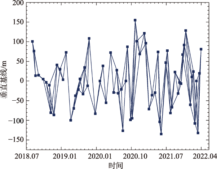 鉴于城市地区后向散射特性较稳定,且形变缓慢连续,采用的影像数据集时间间隔密集,能够保证干涉影像具有较高的相干性,因此选取StaMPS的SBAS方法[11]进行时间序列分析。首先,在GAMMA软件中使用精确轨道文件校正Sentinel-1A影像数据,并进行多视处理。利用SRTM DEM数据进行地理编码,经方位向和距离向频谱滤波后,以2020年1月29日采集的影像为超级主影像进行配准。其次,设定时间基线阈值<60 d,空间基线阈值<200 m,生成150对差分干涉对,时空基线情况如图3所示。然后,利用StaMPS软件,基于振幅离差与相位稳定性原则,筛选出地面共计216 739个高相干性点,通过3D解缠法[33]进行相位解缠,并估计和去除了由DEM、时空基线引起的相位误差,获得时序InSAR地表形变初始结果。