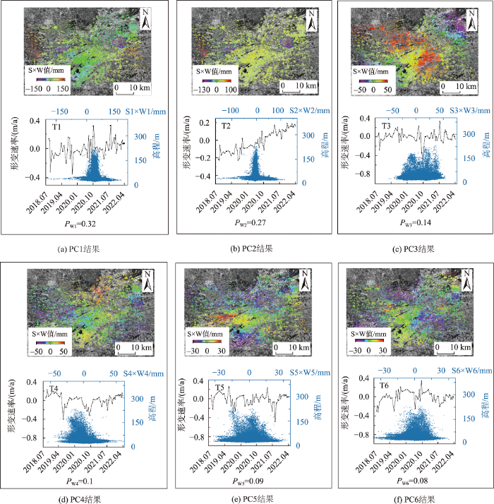 时序InSAR信号的主要信息在主成分分解后被集中在若干主成分中。将初始主成分分量数目参数设定为3,依次分析分解后的主成分。本研究中,当分量数为3~5时主成分分量存在信号杂糅现象,导致主成分的时空规律难以识别;当分量数为7或更多时出现较多低重要性的冗余成分,且存在不同低重要性成分表现出相似时空特征的情况,主要表现为多主成分分量同时表现季节性非线性形变和噪声相位特征;当主成分分量个数为6时,各成分时空规律具有较明显的识别特征。如图4所示,第一主成分(PC1)与第二主成分(PC2)均呈明显的时间相关性,即整个时间段内,