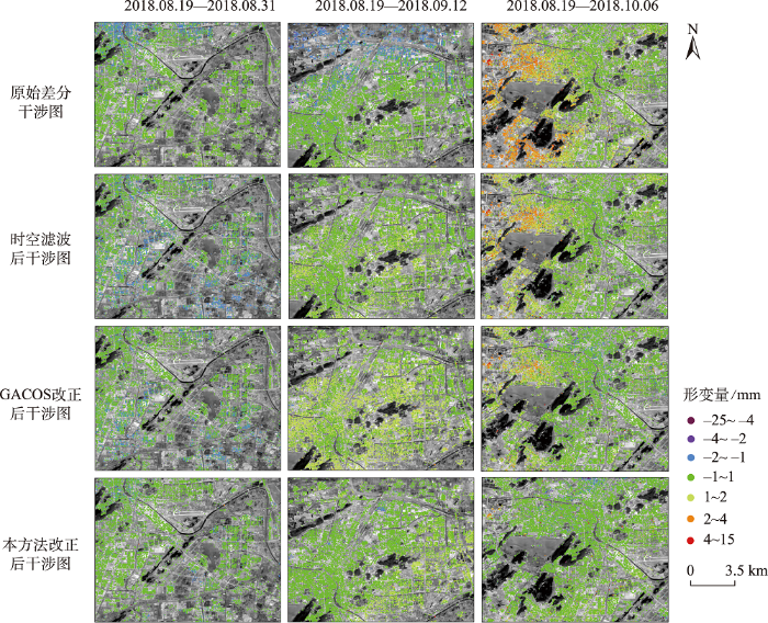 分别采用目前应用较广泛的时空滤波方法和GACOS方法估计和改正3.1节获取的原始时序InSAR数据的误差。选择100 d与80 m×80 m的时空滤波窗口,利用大气相位空间低频和时间高频的特性,对干涉图直接估计大气相位并滤除。利用GACOS系统解算出相应时间和区域的高空间分辨率天顶对流层延迟改正图像,对所有差分干涉图进行大气延迟改正。将2种方法获取的改正结果与本研究结果进行对比分析。图6展示了研究区中3个子区域的原始差分干涉图及利用3种方法改正后的结果。由图可知,时空滤波方法和GACOS均能在一定程度上削弱误差和噪声影响,但在局部区域仍存在较明显的残余误差,或引入额外的噪声。相较之下,本研究方法能够更精准地去除残余误差及和噪声相位。