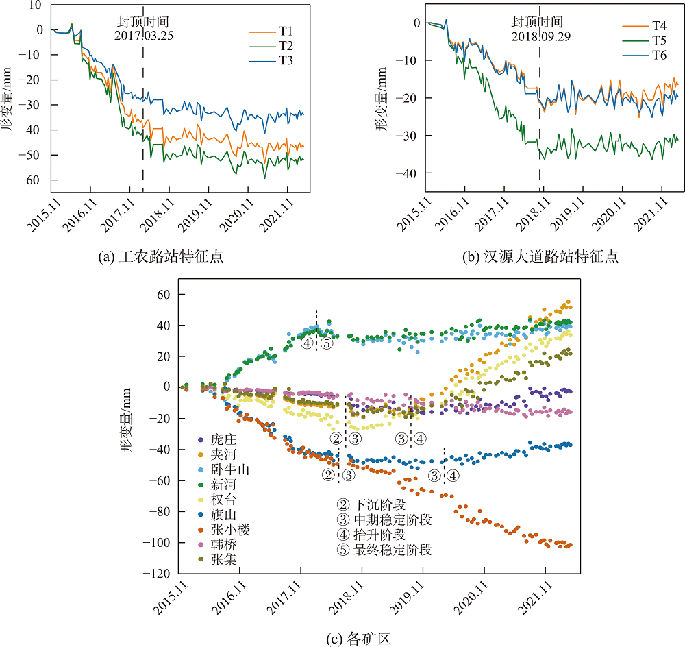 | 图13 2015—2022年地铁沿线特征点及各矿区形变时间序列 |