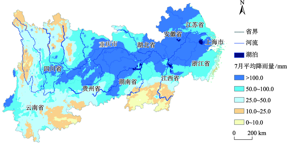| 图4 长江经济带2020年7月平均降雨量分布 |