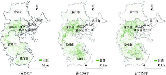 (2)粤西甘蔗主要分布在遂溪县、雷州市和徐闻县,2000—2020年遂溪县、雷州市的甘蔗种植分布呈现扩散趋势,徐闻县甘蔗种植分布呈现收缩趋势。2020年粤西甘蔗种植主要聚集在遂溪县、雷州市北部、雷州市南部、徐闻县北部。
