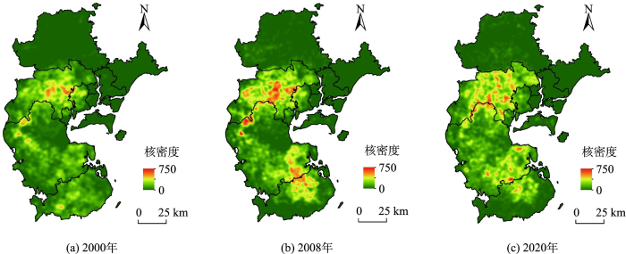 式中:f(x)为空间位置x处的核密度计算函数;h为搜索半径范围;n为分析范围内的点数;K为默认的权重核函数;x-xi为x到点xi之间的距离。