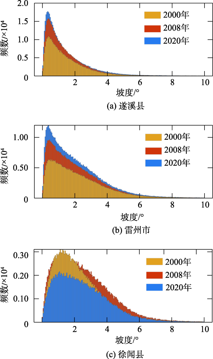 (5)比较各个区县的甘蔗种植区地形特征,遂溪县和雷州市大部分甘蔗种植区地势平坦,2000—2020年新增的甘蔗种植区大多分布于低高程、小坡度的地带,有利于发展机械化作业的潜力,徐闻县大部分甘蔗种植在缓坡区,机械化作业条件较差。