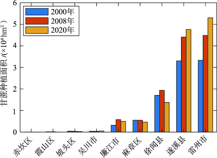 (3)甘蔗种植区的空间聚集特征分析结果表明,2000—2020年遂溪县甘蔗种植区呈现多中心发展和高密度聚集的空间格局,雷州市甘蔗种植区从北部聚集发展至南部、北部2个聚集中心,徐闻县高密度甘蔗种植区从西部迁移至北部。
