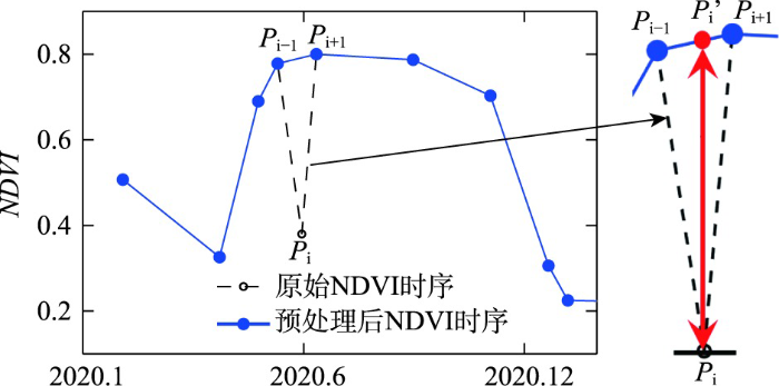利用多时相NDVI构建NDVI时序曲线,为了进一步消除异常观测值的影响,对NDVI时序曲线中的异常值进行剔除。异常值剔除方案如下:对每个NDVI观测点(Pi)建立大小为3的滑动窗口,窗口内包含Pi的前(Pi-1)、后(Pi+1)观测点。对Pi-1和Pi+1观测点进行线性内插,记作Pi',比较观测点Pi和插值点Pi'的NDVI取值大小,当Pi和Pi'的NDVI之差超过0.2并且Pi距离上一次观测的天数超过14天,或者Pi和Pi'的NDVI之差超过0.5并且Pi距离上一次观测的天数超过21天时,将Pi判定为异常观测(图6)。以表1中Landsat数据的观测时相为采样间隔,对NDVI时序曲线进行线性内插,填补缺失值。