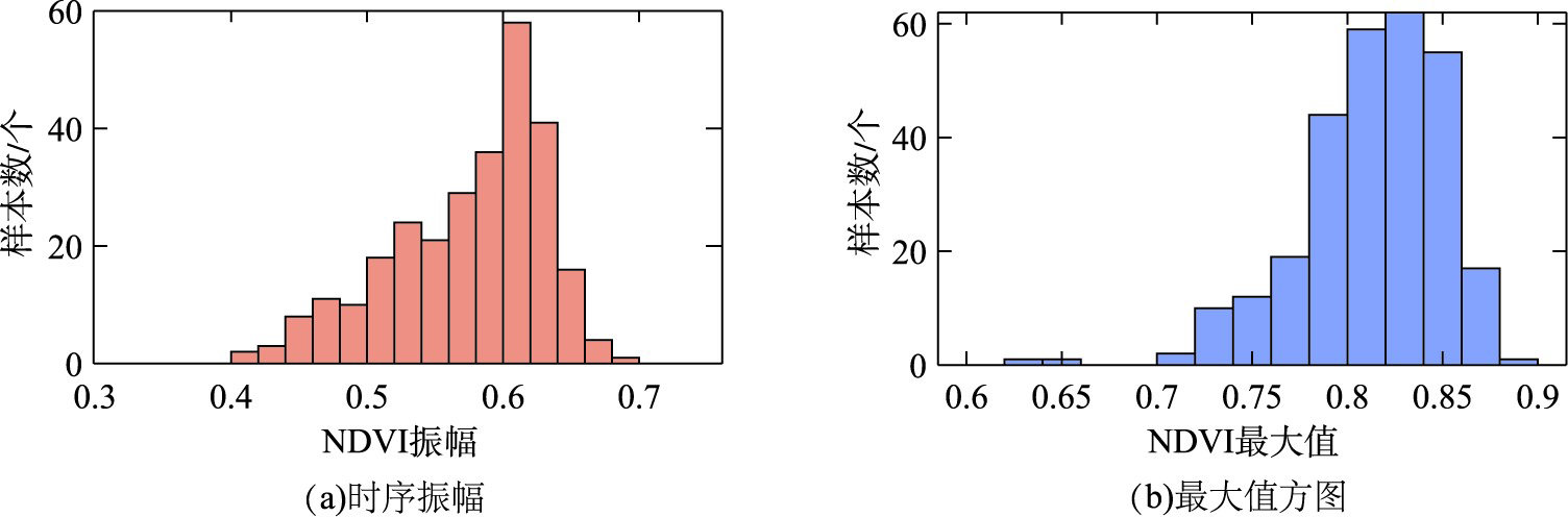 | 图9 甘蔗NDVI时序曲线振幅和最大值直方图 |