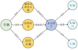 | 水文因子 | 履带式牵引火炮,流速小于1 m/s,最大涉水深度为1.00 m | Crawlertowedgun(?x)^Flowvelocity(?v)^hasFlowvelocity(?x,?v)^Depth(?d)^hasDepth(?x,?d)swrlb:lessThan(?v,1)^swrlb:lessThanOrEqual(?d,1)→hasTrafficeStatus(?x,true) | ![]() |