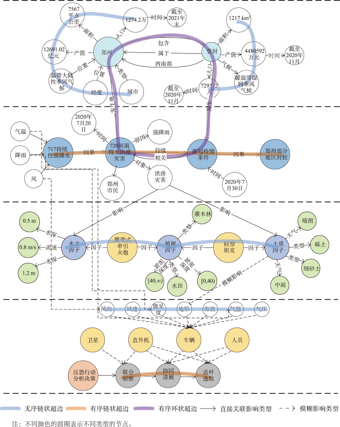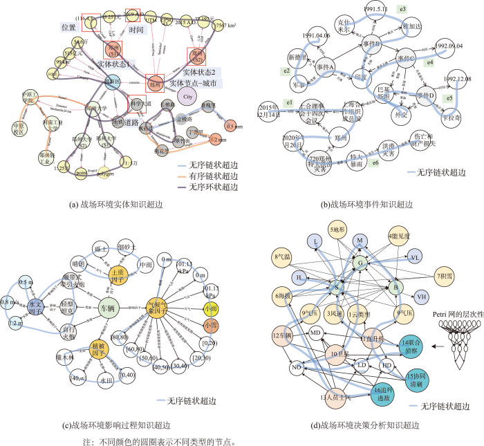 第①类超边主要包括:① 要素知识子网络内部超边,主要表示各类实体要素的属性值;② 事件子网络内部超边,主要表示形成事件的“5W1H”属性值,以及事件与事件之间的继承、发展、因果等关系;③ 环境影响过程子网络内部超边,主要表示多个环境影响要素对武器装备或人员的综合影响; ④ 环境服务决策子网络内部超边,主要表示环境、装备性能对作战行动的决策影响。