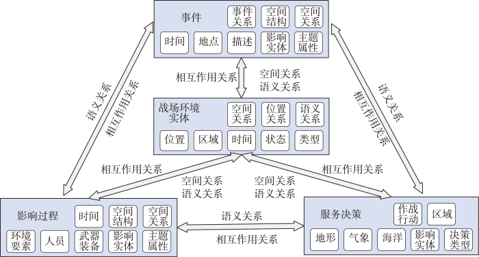 环境基础知识主要是对环境基本客观信息的刻画与表述,通过各类传感器对战场客观环境进行信息记录的结果,主要包括实体知识和事件知识(图1)。例如:地球表面地形的自然起伏状态,地理信息实体的位置、属性以及空间关系,气象的温度、湿度、气压、降雨、能见度等,地质的土质、土壤类型、岩层属性等,海洋温度、盐度、密度、海洋气压、海底地形起伏等,电磁的磁场、信号等,人口、宗教、文化等人文知识。事件知识包括地理事件、人文事件和信息事件。例如,地理事件包括山体滑坡、泥石流、洪涝灾害、降雨、水土侵蚀、水土流失等事件,人文事件包括政治事件、经济事件、军事事件、文化事件,信息事件包括信号干扰、网络舆情、网络侦察、网络攻击、网络防御等事件。