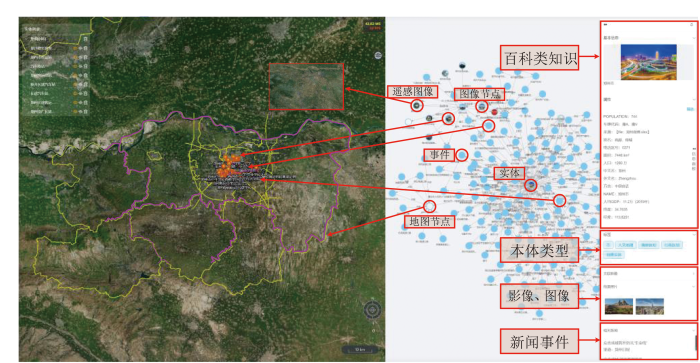 知识关联是基于战场环境知识要素类型(人、目标、时间、地点、事件等不同类型),以其中的一个主题或多个主题组合进行要素关联,构建新的知识场景。由于不同的要素在关联中描述的方式不同,如时间一般按照序列关联,人或事件按照语义类型、层次、等级等特征进行关联,地点一般按照时间位置或区域范围进行关联。基于战场环境要素实体,将实体属性、影像/街景、事件、地理分析文档等跨域多源数据进行关联,如图14所示。从语义上实现多源异构战场环境数据的检索,且能够与三维虚拟战场环境实现关联映射,基于图谱语义节点实现对三维场景的交互。