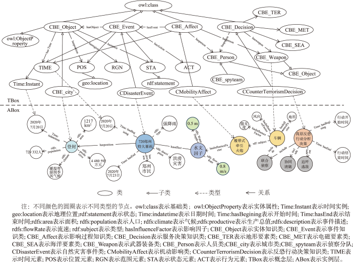 知识超图是利用超图理论对大规模的知识图谱进行超图建模,是一种超图结构的知识图谱。它使用超边(即多元关系)描述现实世界中多个实体之间的关系[18]。本文借鉴知识超图理论,基于战场环境知识元模型对战场环境复杂多元关系进行建模,构建战场环境时序超图知识表示模型,如 图4所示。首先,构建CBE_Object、CBE_Event、CBE_Affect、CBE_Decision等基础类并建立类之间的关系;然后,抽取基本核心元素TIME、POS、RGN、STA、ACT并用OWL语言继承表示;实例层主要继承自概念层,从实体、事件、影响过程、服务决策4个层次建立实例层间关系和实例与概念层间关系,整个超图网络通过时间元素进行驱动。