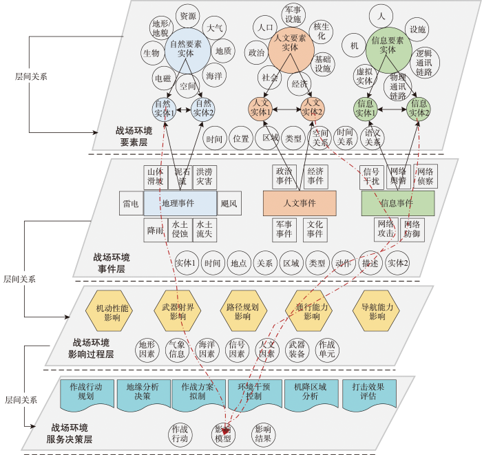 环境服务决策知识,主要指最终为作战行动决策提供环境保障服务的知识,多是指各类环境综合影响评估模型、作战行动环境影响效能评估方法等,与作战行动和武器装备密切相关。例如,恶劣气象环境对作战行动的影响评估,陆地机动、空中运输、目标毁伤等环境辅助决策知识。