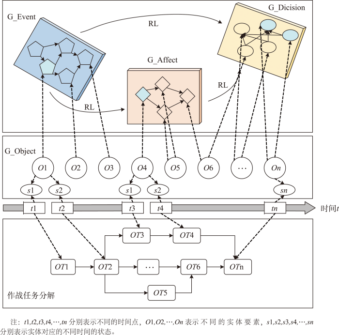 令$o_{i} ∈ G_{BE\_Object}$, $e_{j} ∈ G_{BE\_Event}$, $a_{k} ∈ G_{BE\_Affect}$, $d_{l} ∈ G_{BE\_Decision}$ 分别表示$G_{BE\_Object}$, $G_{BE\_Event}$, $G_{BE\_Affect}$, $G_{BE\_Decision}$ 4个子网络的任一节点,变量$\varphi\left(o_{i}, e_{j}\right), \varphi\left(e_{j}, a_{k}\right), \varphi\left(a_{k}, d_{l}\right)$分别表示不同类型之间是否存在映射关系,由此战场环境知识超边可表示为:$SE=\left\{o_{i}, r_{\varphi}, e_{j}, r_{\varphi}, a_{k}, r_{\varphi}, d_{l}\right\}$,其中